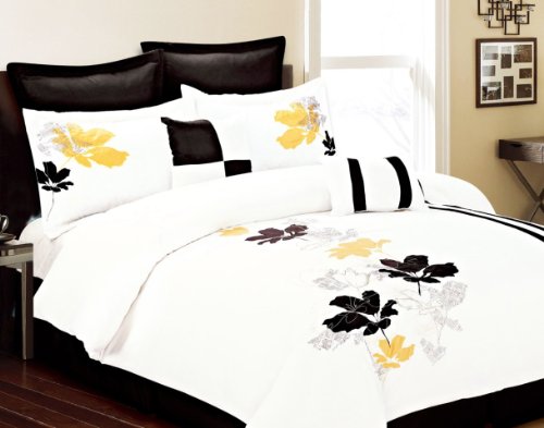 Over size 8-piece comforter set offers a modern look. add instant charm. Matching bedskirt and throw pillows provide finishing touches.